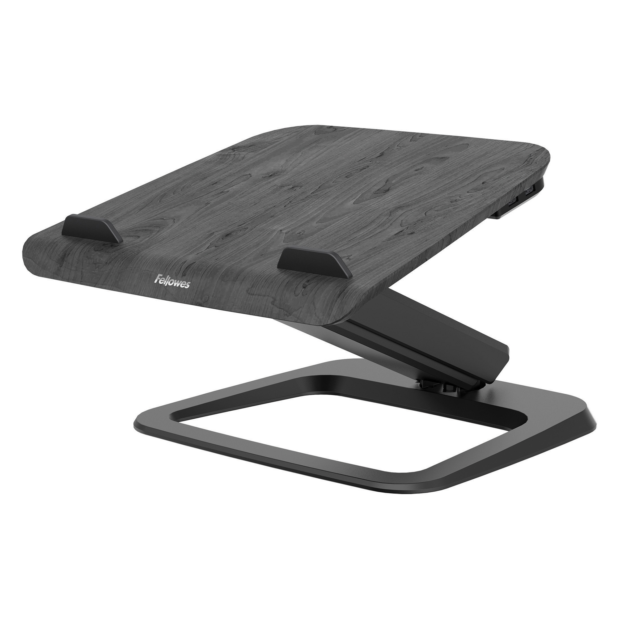 Base in elegante alluminio con finitura in vero legno, disponibile nei colori nero o bianco.