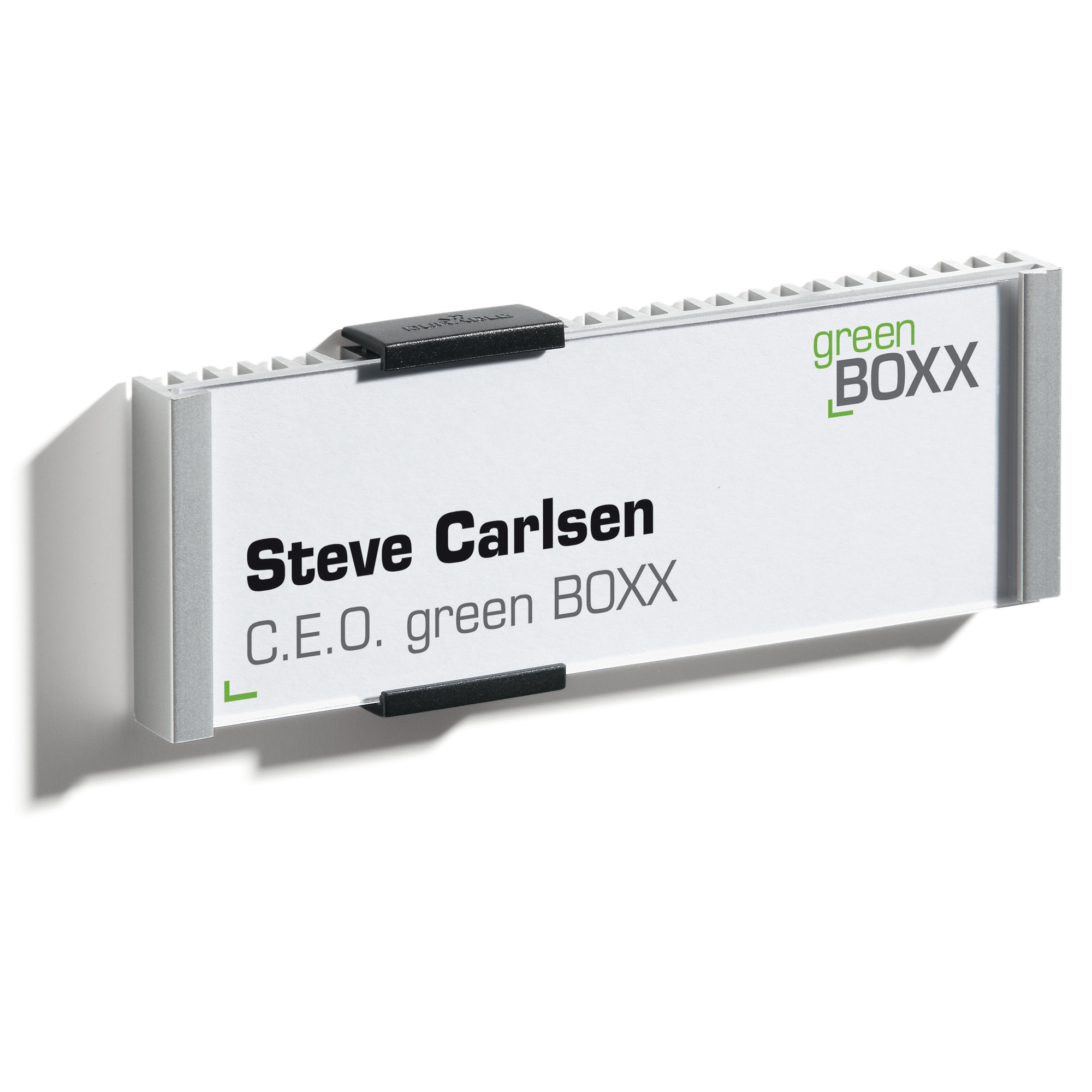 Targhe per porte e pareti professionali, dal design classico, funzionale e raffi nato, ideali per ogni applicazione. Pannello frontale in acrilico trasparente antirifl esso e retro in alluminio di alta qualità. Doppio sistema di fi ssaggio a vite o con bi-adesivo, ideale in ambienti dove non si desidera praticare fori. Il cartoncino inserto, certifi cato PEFC, puo’ essere personalizzato e stampato on-line tramite il software gratuito DURAPRINT®. Inclusi nella confezione inserto in cartoncino e kit di fissaggio. Formato contenuto 14,9x5,3cm.