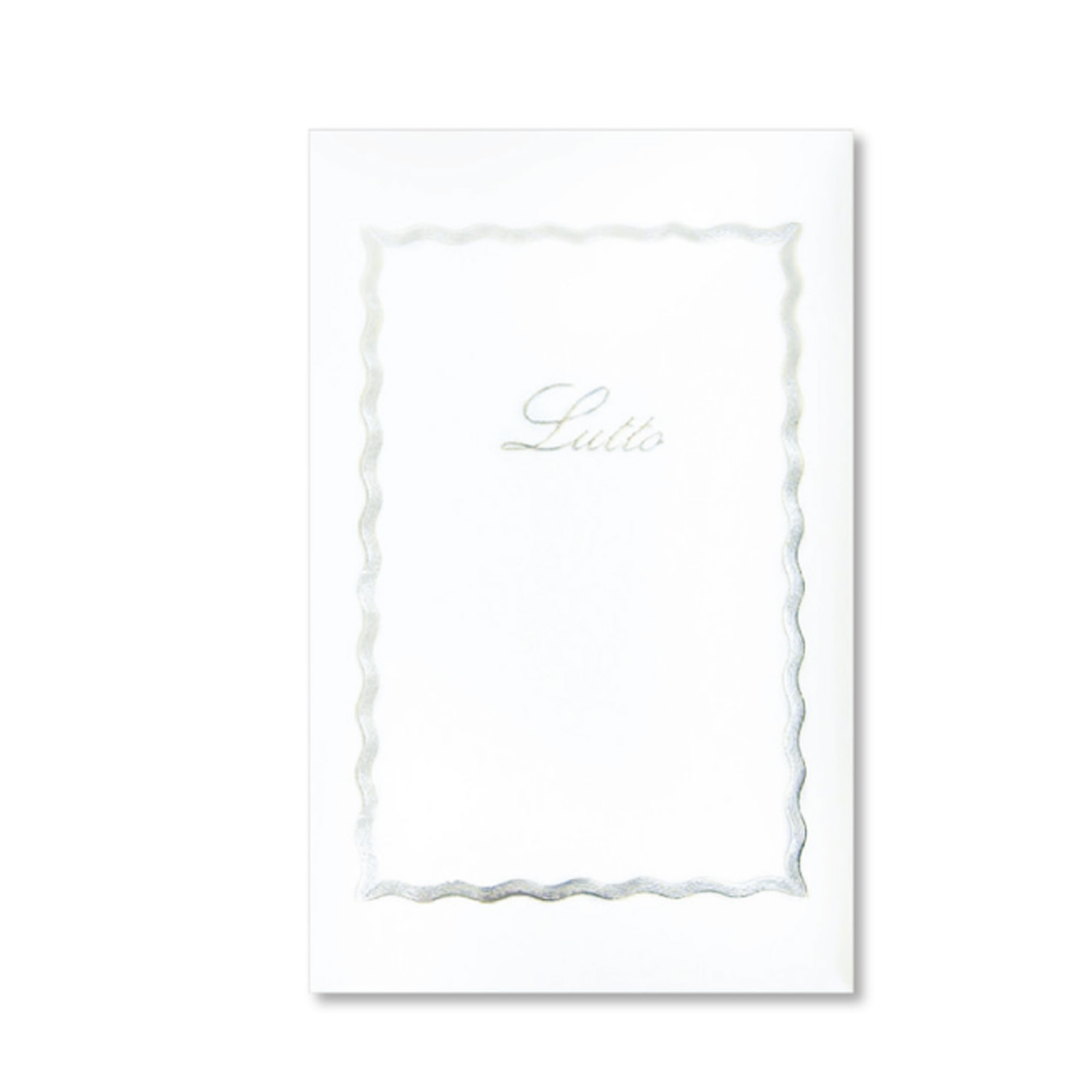 Busta e biglietto bianco con stampa a lutto in angolo. Biglietti da 200gr coordinati a buste con patella e taglio a punta da 85gr. Confezionate in taschette da 10 buste + 10 biglietti.