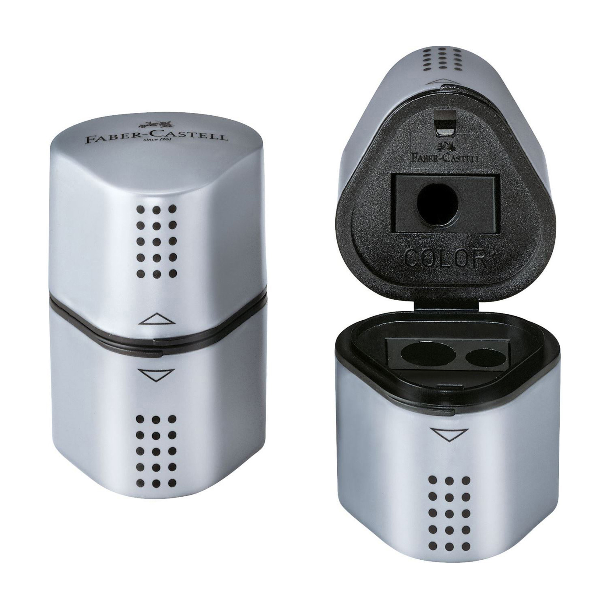 Descrizione dettagliataTempera matite in plastica grigia a 3 fori per matite standard, jumbo e colorate. Adatto per temperare tutte le matite rotonde, triangolari ed esagonali. Dotato di doppio serbatoio. Color argento.