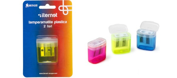 Descrizione dettagliataTemperamatite in plastica 2 fori con serbatoio e coperchio.Dimensioni singolo temperino LxHxP mm. 38x42x25.Colori assortiti blu, rosso, verde, giallo