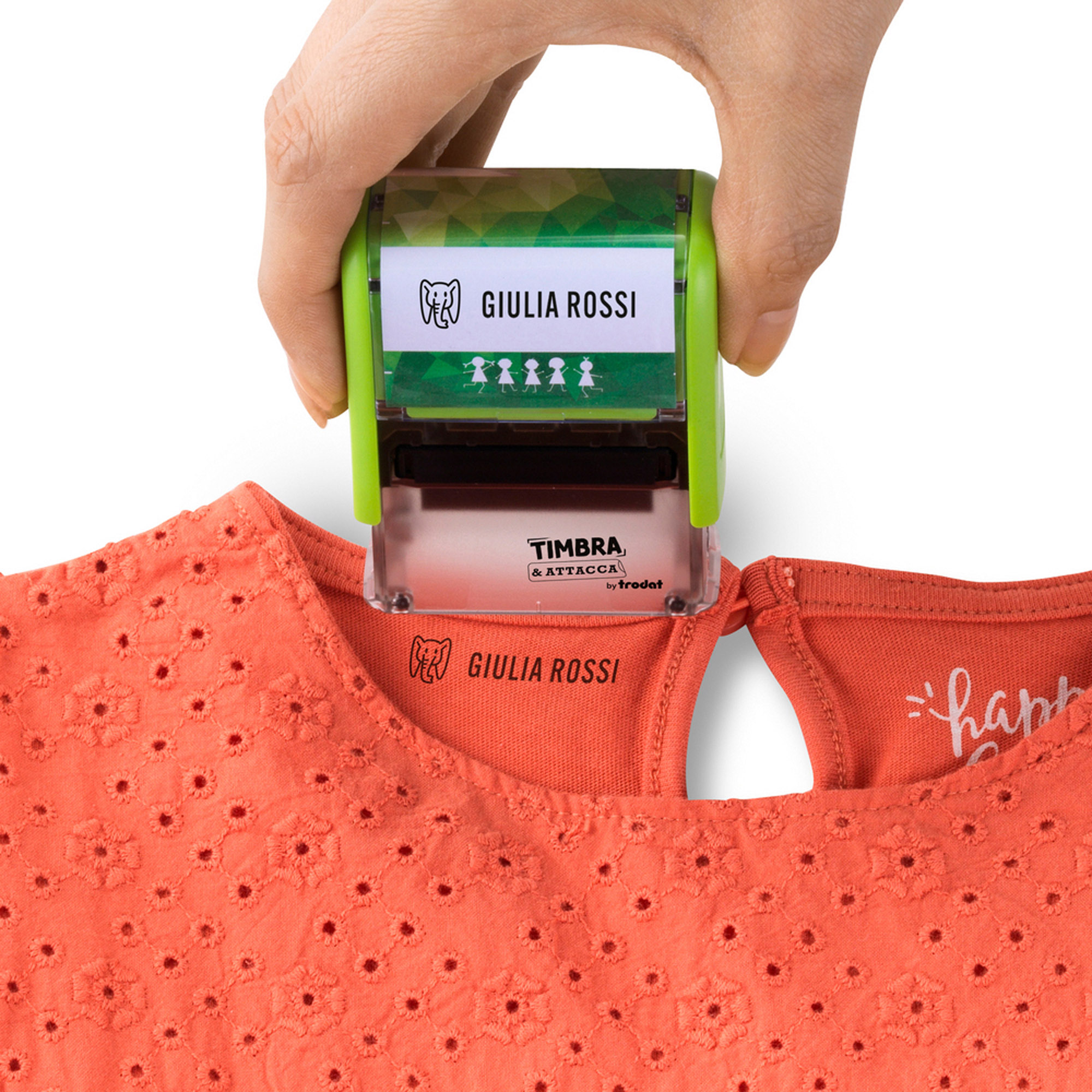 Timbra direttamente su tessuto o sulle etichette adesive e attaccale ovunque: scarpe, tupper ware, giocattoli, matite etc Componi il tuo testo con le simpatiche icone fino a 14 caratteri per riga, max 3 righe.