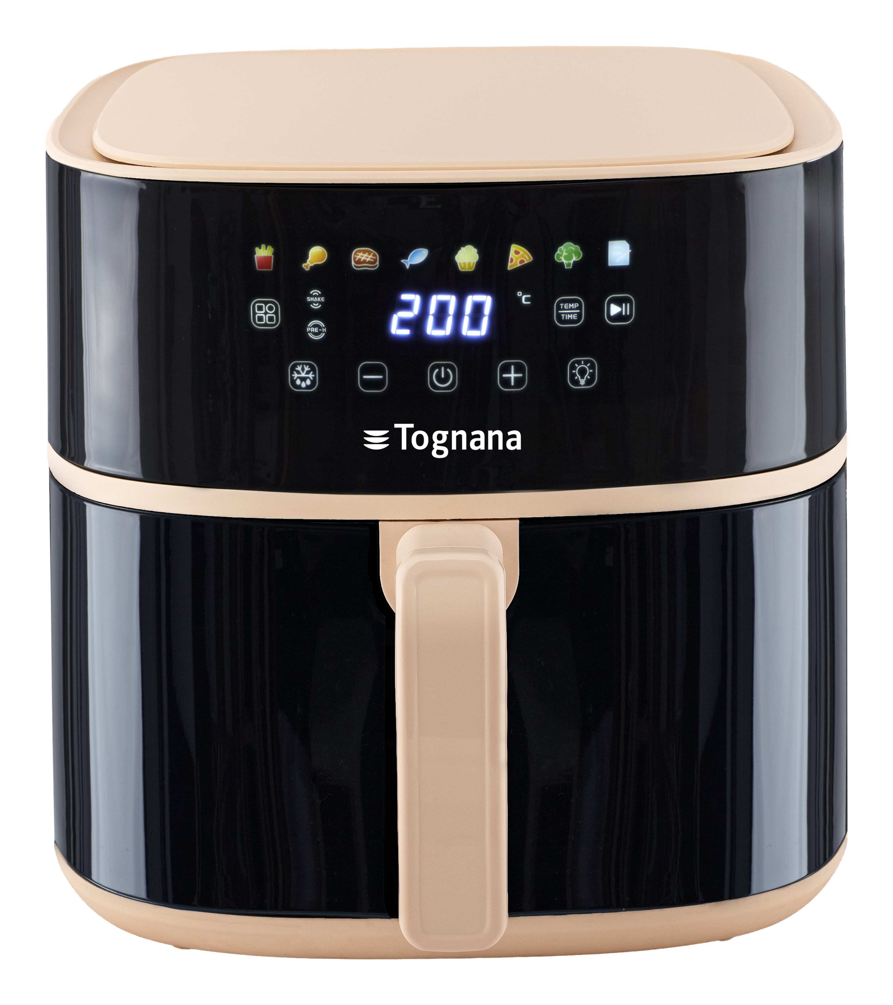 Tognana Porcellane D2DFA05IRCH. Tipo di prodotto: Friggitrice ad aria calda, Capacità: 8 L, Temperatura (min): 80 °C. Tipo di costruzione: Singolo, Colore del prodotto: Nero, Champagne, Tipo di controllo: Touch. Potenza: 2000 W, Tensione di ingresso AC: 220 - 240 V, Frequenza di ingresso AC: 50/60 Hz. Larghezza: 325 mm, Profondità: 410 mm, Altezza: 320 mm