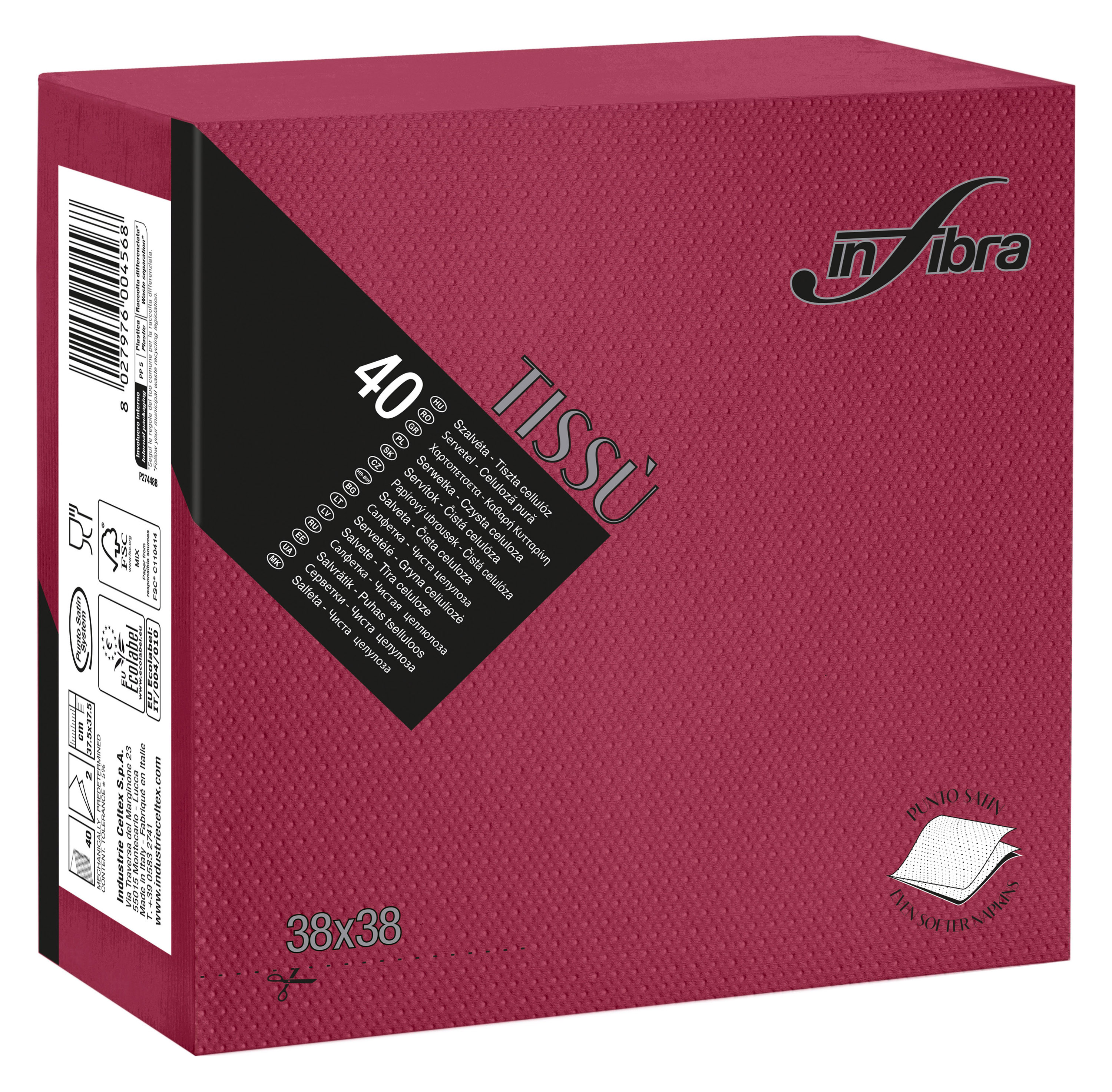 Descrizione dettagliataTovagliolo in pura cellulosa colorata, bordeaux, 2 veli incollati, formato 38x38 cm, goffratura Punto Satin.Cartone da 36 confezioni da 40 tovaglioli per un totale di 1440 tovaglioliLicenza EU ECOLABEL: IT/004/010Licenza FSC: C110414