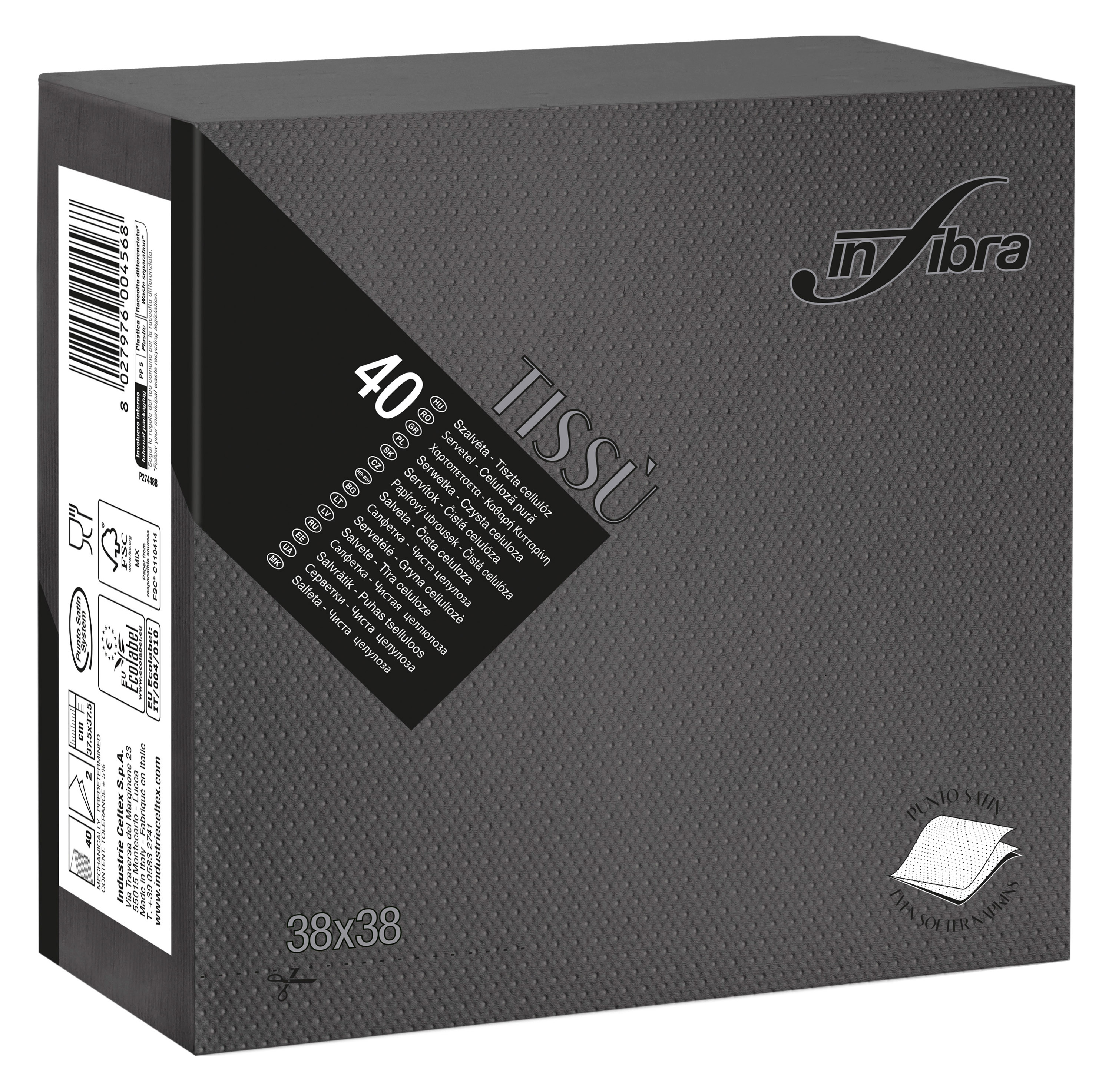 Descrizione dettagliataTovagliolo in pura cellulosa colorata, nero, 2 veli incollati, formato 38x38 cm, goffratura Punto Satin.Cartone da 36 confezioni da 40 tovaglioli per un totale di 1440 tovaglioliLicenza EU ECOLABEL: IT/004/010Licenza FSC: C110414