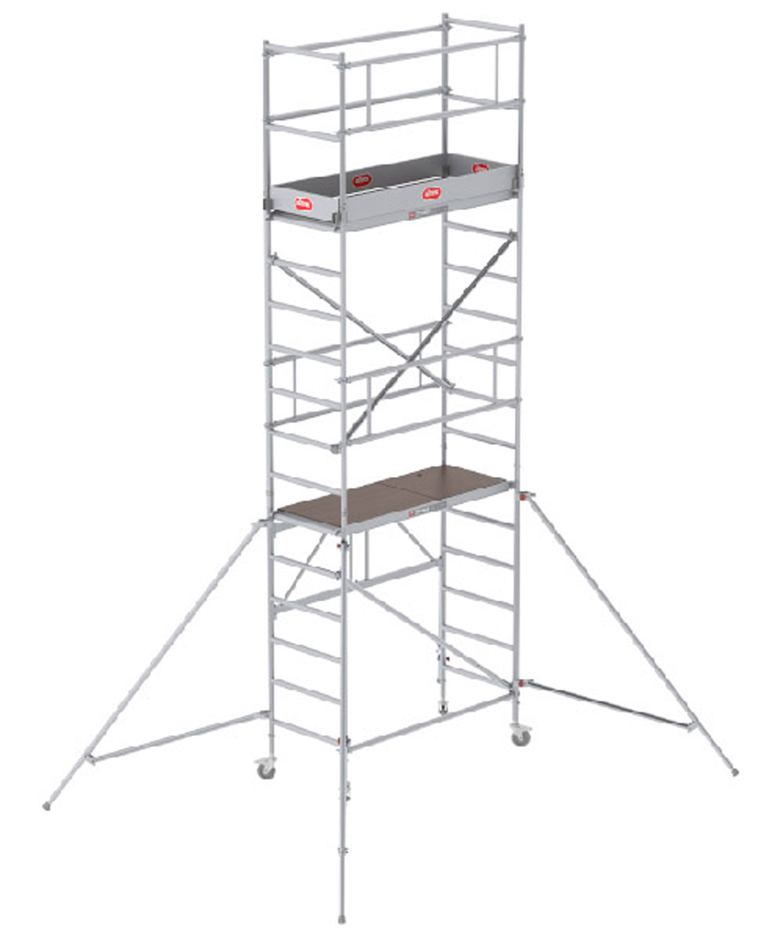 Trabattello su ruote/pieghevole a larghezza singola. I telai a larghezza singola di 0,75 metri si adattano a tutte le porte standard. Il sistema è modulare e facile da prolungare. Ci sono pochissime parti separate e l’intera unità si piega a metà, occupa pochissimo spazio ed è facile da trasportare e riporre.