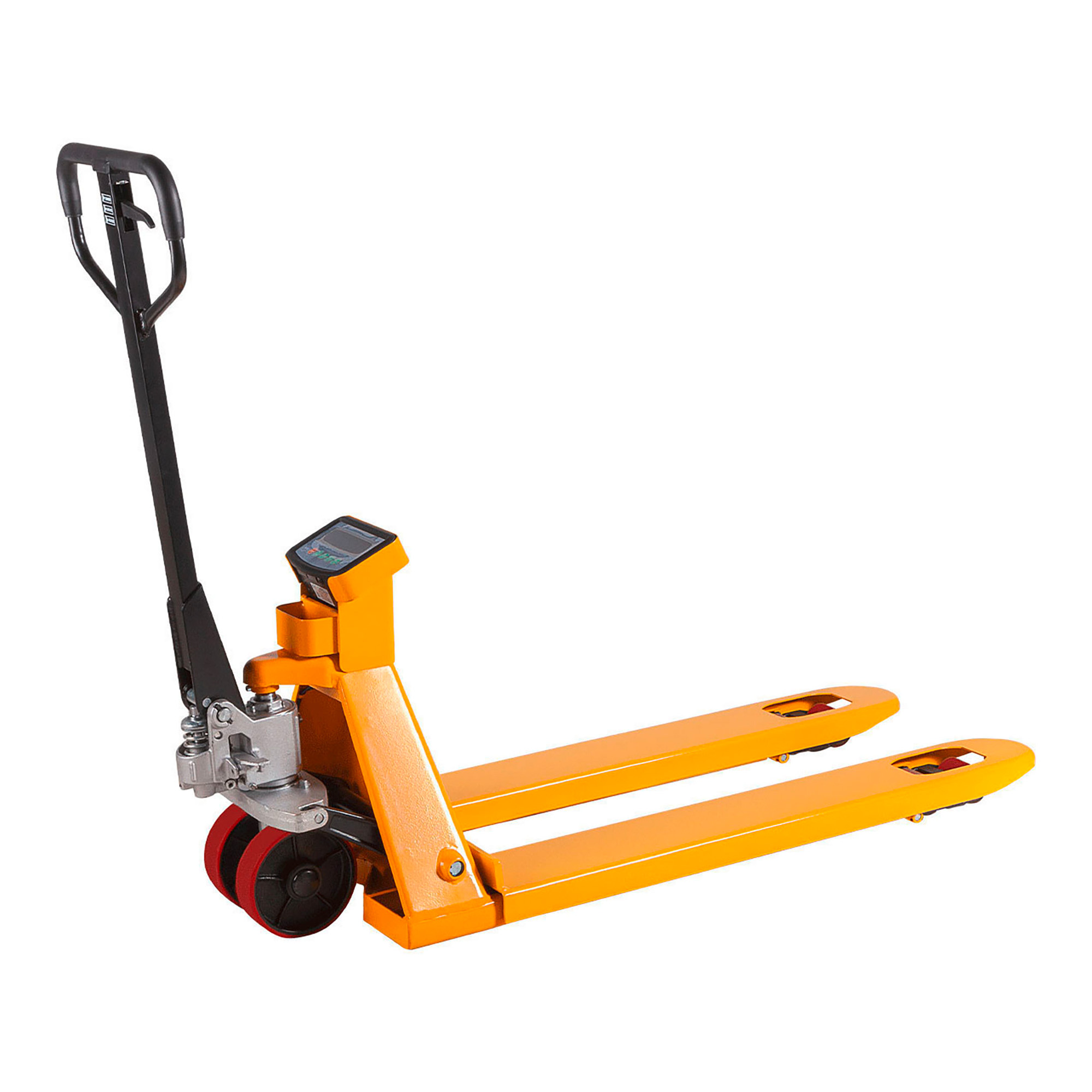 Transpallet manuale pesatore con sistema integrato, dotato di timone con leva a tre posizioni, efficiente pompa ad olio, ruote direttrici e rulli doppi in poliuretano che garantiscono scorrevolezza e bassa rumorosità, velocità di abbassamento proporzionale alla pressione dell’operatore sulla leva, ideale per movimentare merce consentendo di pesare il carico sul posto senza l’utilizzo di ulteriori accessori riducendo notevolmente il tempo