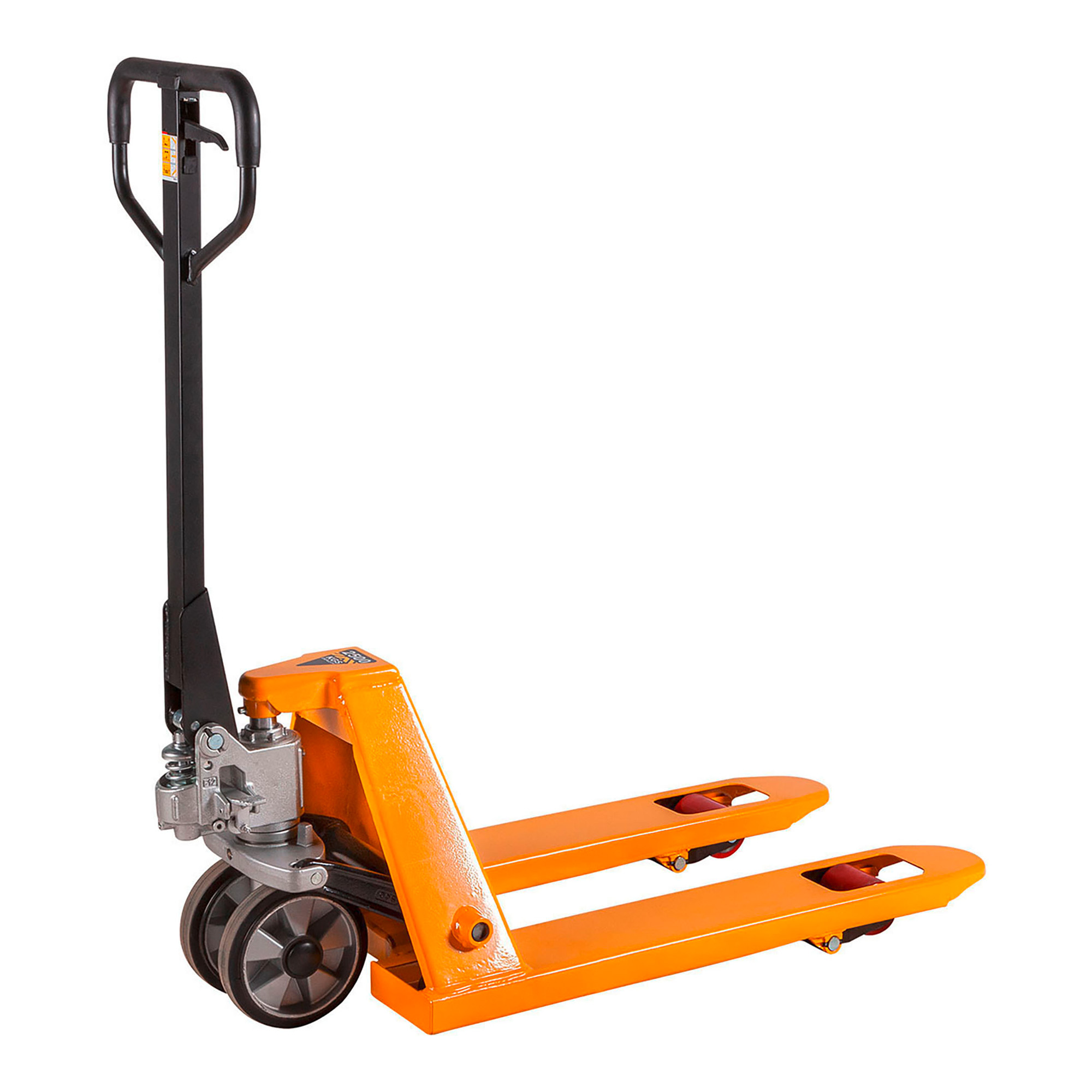 Transpallet manuale a forche corte adatto per un uso intensivo, dotato di timone con leva a tre posizioni, efficiente pompa ad olio, ruote direttrici in gomma e rulli singoli in poliuretano che garantiscono scorrevolezza e bassa rumorosità, velocità di abbassamento proporzionale alla pressione dell’operatore sulla leva, ideale per movimentare merce in spazi ristretti.