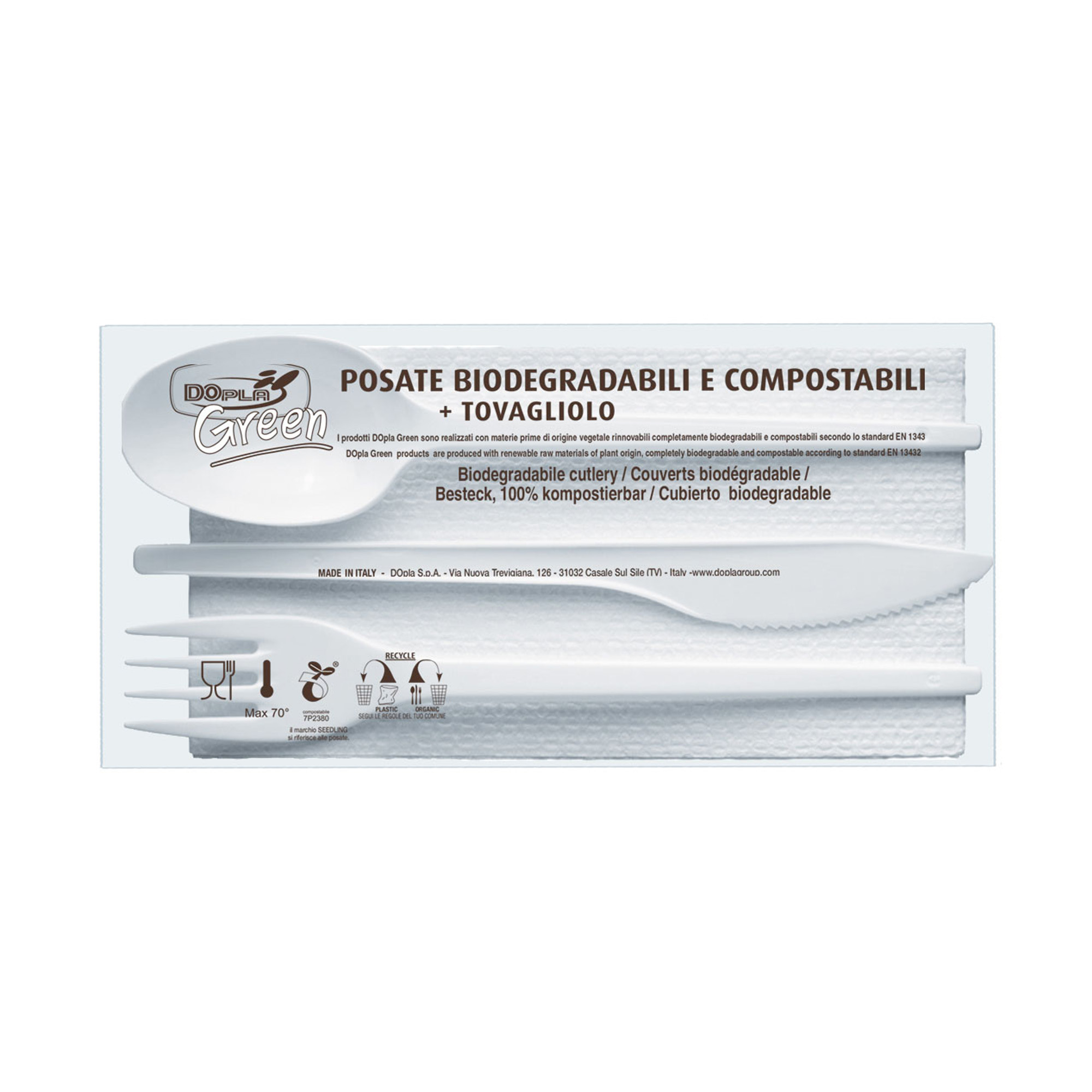 Tris posate (coltello, forchetta e cucchiaio) di colore avorio in Estabio compostabile e biodegradabile in conformità alla norma EN 13432. Per alimenti Max 70°C. • Lunghezza posate 180mm • Tovagliolo a 2 veli 33x33cm • Compostabili e biodegradabili
