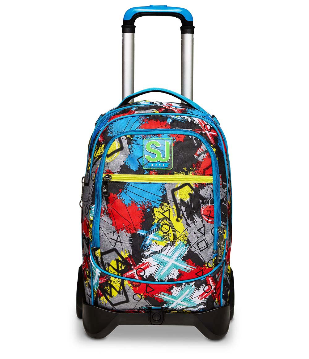 Ciao! Sono il sorprendente zaino con carrello sganciabile SJ GANG! Pieno di colore e multiuso, sono molto spazioso e dotato di tasca frontale: dentro puoi mettere libri, quaderni e tutto quello che ti serve per scuola e il resto della giornata. Inoltre sono sia comodo da indossare sulle spalle grazie a schienale e spallacci imbottiti e rivestiti in tessuto, sia maneggevole da trascinare come trolley, agganciandomi al carrello dotato di ruote da 10 cm e doppia barra telescopica oltre che di protezioni angolari e fondo rinforzato che garantiscono una buona stabilità e la protezione del contenuto.