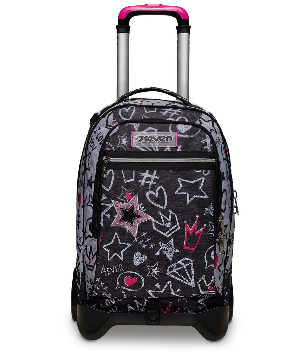 Il Trolley Seven Jack-2WD è uno zaino con carrello sganciabile dotato di ruote da 10 cm. Lo zaino è capiente, da riempire con quello che ti serve: libri, quaderni per scuola, o il cambio per l'allenamento. Schienale e spallacci imbottiti inoltre rendono lo zaino comodo da indossare sulle spalle, mentre se lo agganci al carrello dotato di doppia barra telescopica, protezioni angolari e fondo rinforzato è maneggevole, stabile, pratico e sicuro da trascinare come trolley.