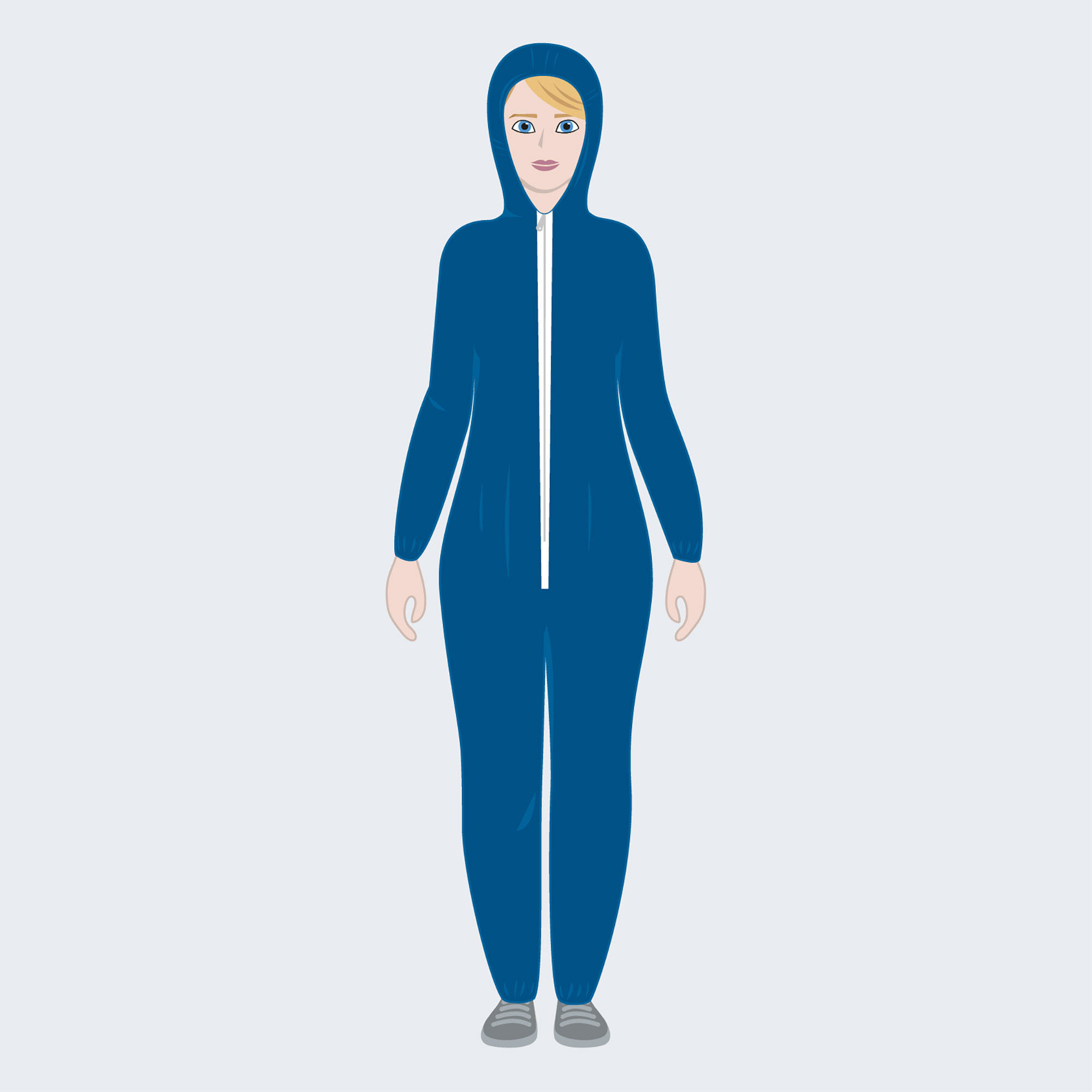 Tuta in PLP con cappuccio, chiusura con cerniera, elastico al cappuccio, ai polsi e alle caviglie, non sterile.