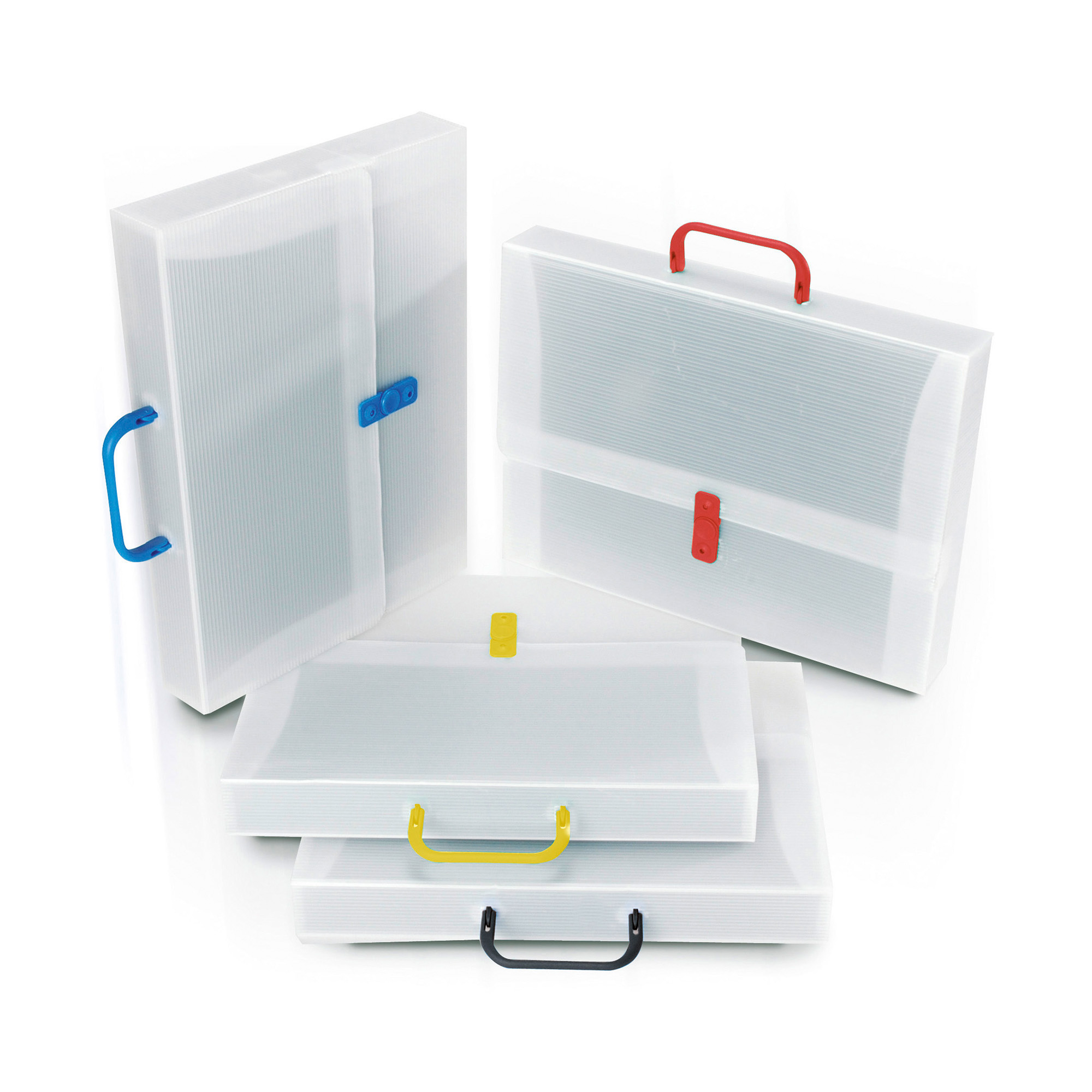 Maniglia e chiusura in plastica colorata nelle varianti azzurro, rosso, giallo e nero (colori assortiti nell'imballo).