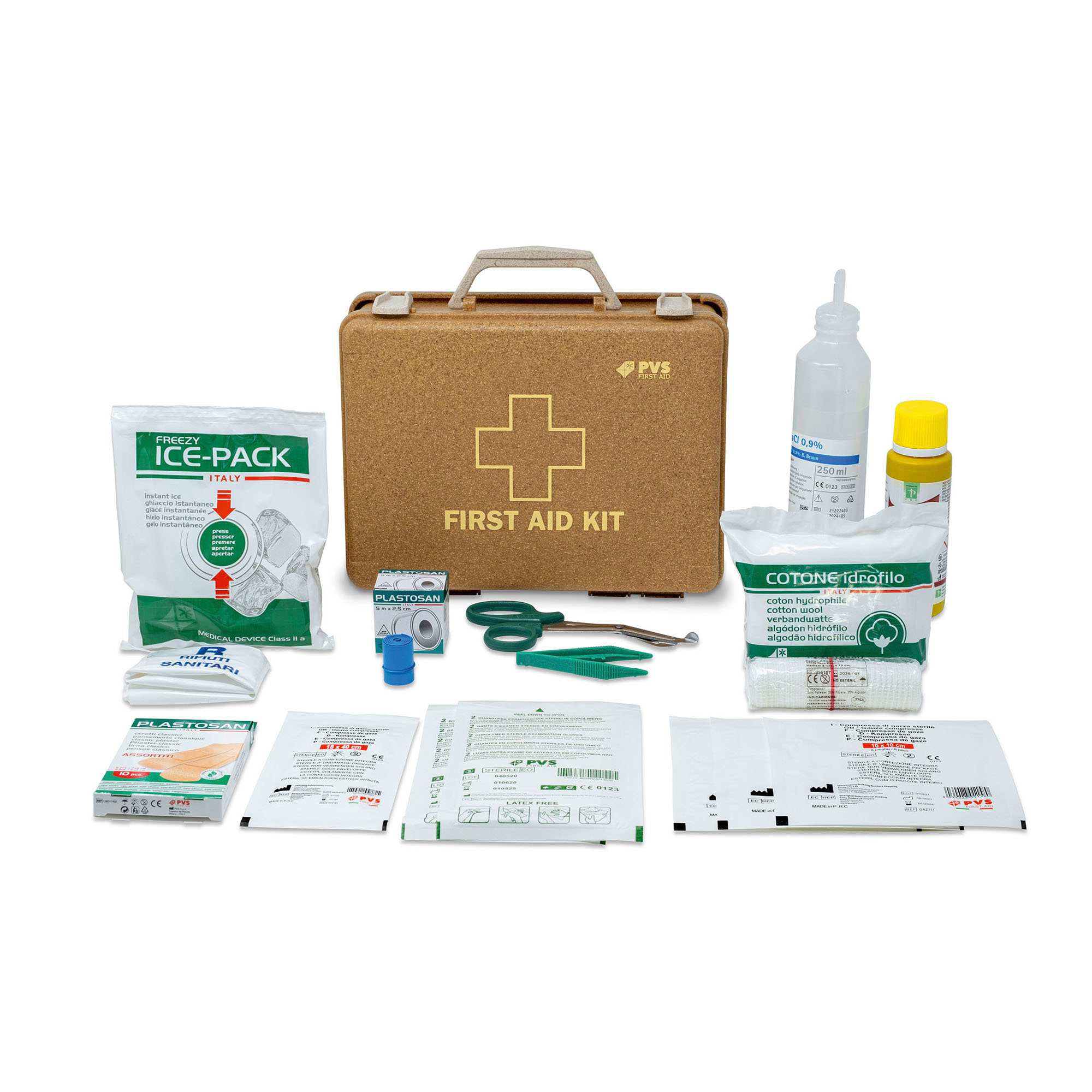 Contenuto a norma dell’ALLEGATO 2 D.M. 388 del 15 luglio 2003 (art. 1) G.U. 27 del 03 febbraio 2004 D.L.81 del 09 aprile 2008 art. 45. I prodotti definiti dispositivi medici, contenuti nel kit pronto soccorso sono conformi alla direttiva CE 93/42 al DL 24.2.97 e al 2007/47/CEE.