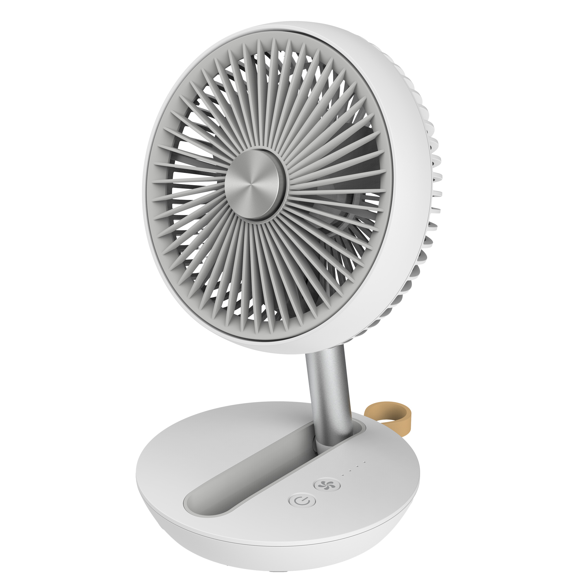 Ventilatore da tavolo multiposizione con deflettore. Alimentazione: motore DC Batteria: al litio ricaricabile 18650 - 4000 mAh, 3.7V Input di ricarica: USB-C 5V Max 2A Potenza: 5W Diametro: 17 cm - 3 pale Funzioni: 4 velocità, diffusore inseribile, testa direzionabile fino a 120°, sostegno direzionabile fino a 70°, richiudibile e trasportabile, ricarica tramite cavo USB-C Dotazioni: display pulsanti ed indicatore led della velocità settata, cavo USB-C, gancio in simil pelle per appendere il ventilatore Autonomia: 4 ore alla massima velocità e 15 ore alla minima velocità Tempo di ricarica: 4 ore da completamente scarico Materiale: ABS Peso: 660 g Dimensioni: 18,7 x 17 x 28 (h) cm Colore: argento e bianco opaco